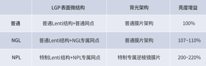 導光板(LGP)作為顯示模組中的核心部件,是亮度增益的主要擔當,蘇大維格應該需求開發了NGL和NPL導光板,在亮度增益上給客戶提供不同程度的解決方案。